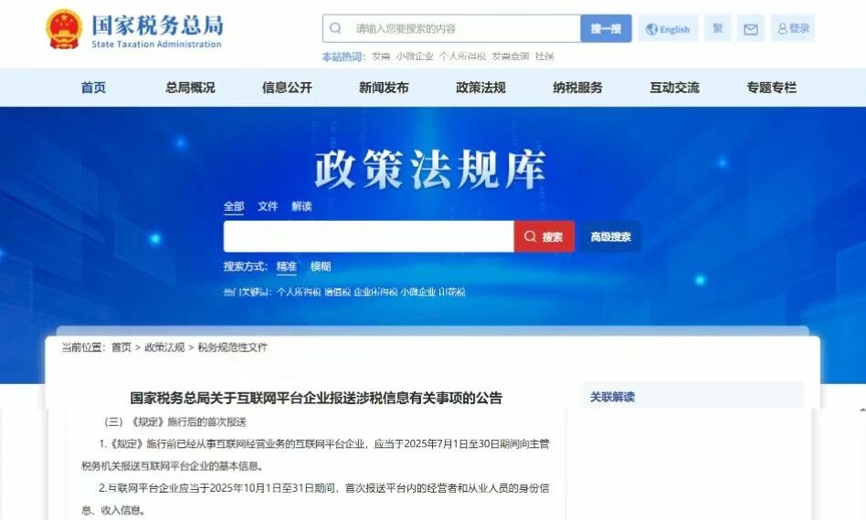 今年6月,國務(wù)院公布《互聯(lián)網(wǎng)平臺企業(yè)涉稅信息報送規(guī)定》(國務(wù)院令第810號),要求互聯(lián)網(wǎng)平臺企業(yè)按季度向稅務(wù)機關(guān)報送平臺內(nèi)經(jīng)營者和從業(yè)人員的身份及收入信息,首次報送將于2025年10月1日開始。