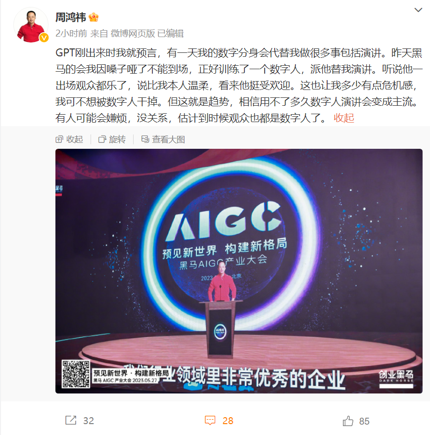 2023年黑馬AIGC產業大會,360集團創始人因為嗓子啞了不能到場,便訓練了數字人代替演講,隨后其在微博發文表示,觀眾認為數字人比本人溫柔,讓他頗具危機感。
